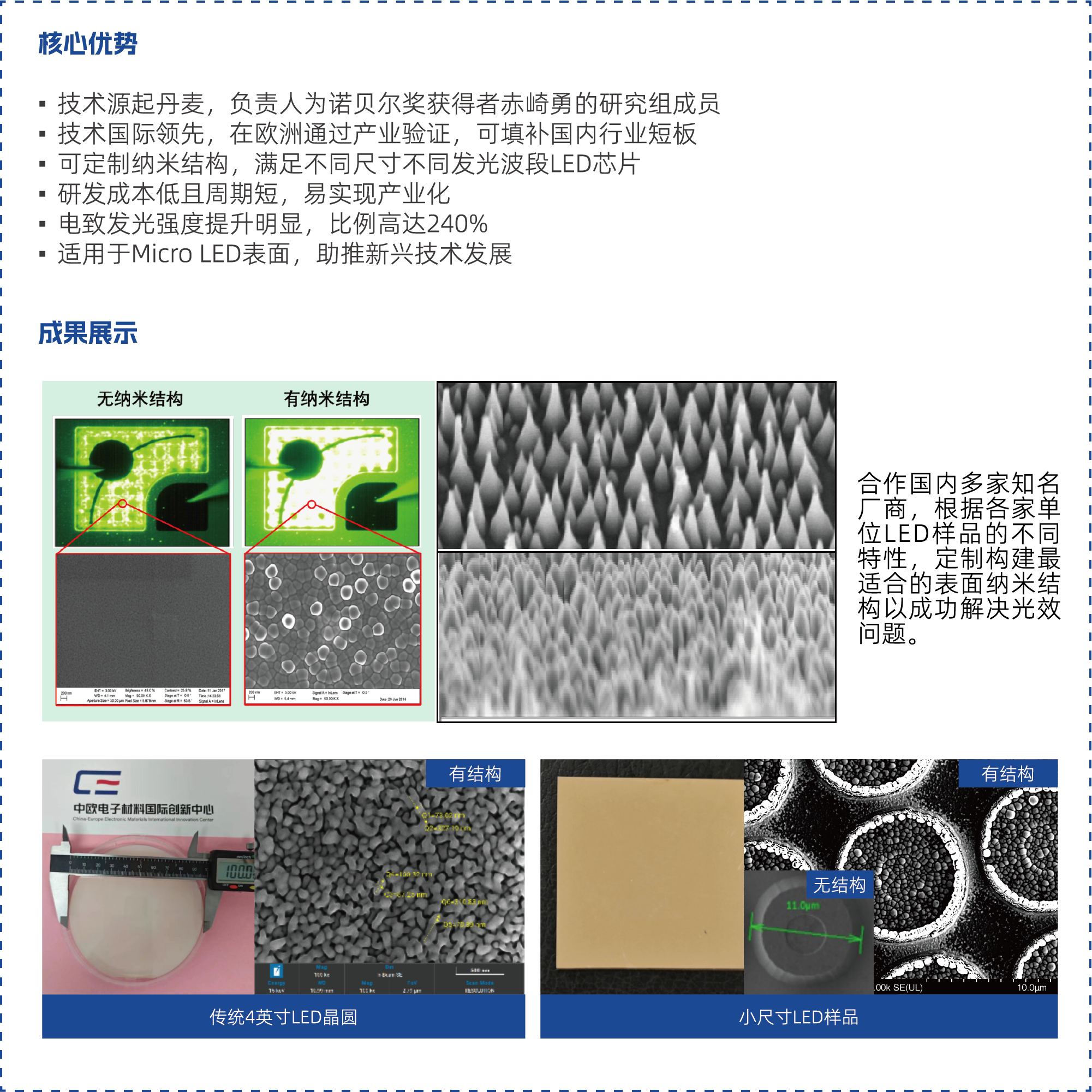“十四五”时期,安徽省围绕新型显示领域开展重大专项工作,旨在加强技术研发、产品制造、应用部署等环节的统筹衔接,做强新型显示产业链。因此,对于LED的尺寸、发光效率提出了更高要求,产生了新的技术壁垒。丹麦Light Extraction公司通过干法刻蚀制备纳米结构,可应用于 mini/micro LED,从而获得更小、更亮、更高效的LED芯片,进一步推动显示、背光及照明等领域的发展。