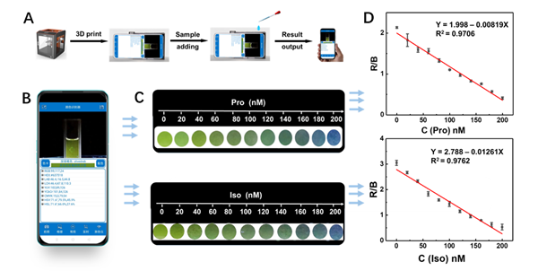鉴于此,研究人员基于有机磷杀虫剂与特异性适配体之间强结合能力,构建了剂量敏感的多色荧光适配体传感器。绿色适配体染色剂(SG-I)可特异性插入适配体G-四联体结构,诱导其绿色荧光显著增强,构成具有绿色荧光发射的传感体系。当向该传感体系中加入有机磷杀虫剂后,有机磷杀虫剂分子与适配体通过π-π芳香堆积结合,形成更稳定的复合产物,破坏了SG-I与G-四联体的结合,导致绿色荧光猝灭。同时,π-π芳香堆积会引起G-四联体本征蓝色荧光的增强,传感溶液荧光颜色由绿色变为蓝色,进而实现了对丙溴磷和水胺硫磷的可视化检测,检测限(LOD)分别低至2.48 nM和3.01 nM。此外,研究人员结合3D打印技术及智能手机颜色识别器,开发了便携式智能荧光检测平台,可在实时、现场条件下对有机磷杀虫剂进行快速可视化定量监测,为农药残留现场快速检测提供了新的策略。