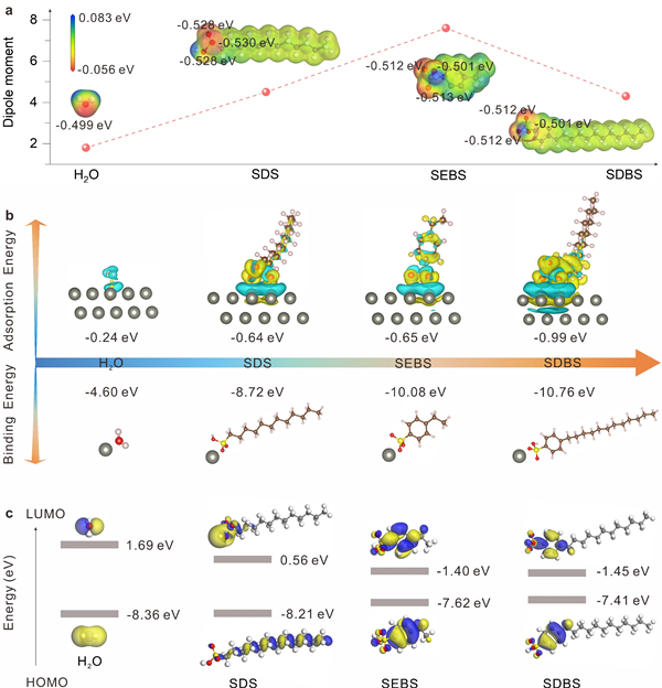 图1. (a)H2O、SEBS、SDS和SDBS分子中O原子电荷和分子DM值;(b)不同分子与Zn2+的结合能,以及不同分子在Zn表面的吸附能;(c)不同分子的LUMO和HOMO能级值。