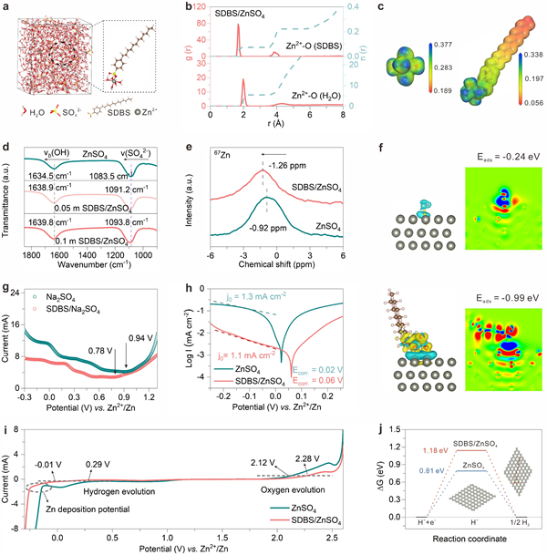 图2. (a)SDBS/ZnSO4电解液中MD模拟快照;(b)SDBS/ZnSO4电解液中Zn2+-O (添加剂)、Zn2+-O (H2O) 的配位数和RDFs;(c)不同溶剂化结构 (Zn(H2O)62+和Zn(H2O)5SDBS+) 的静电势;(d)不同电解液的FTIR光谱;(e)ZnSO4和SDBS/ZnSO4电解液的67Zn NMR谱;(f)锌表面H2O和SDBS的吸附能和相应的差分电荷密度图,黄色和蓝色分别表示电子的积累和损失;(g)添加/不添加SDBS时Na2SO4溶液的差分电容曲线;(h)ZnSO4和SDBS/ZnSO4电解液的Tafel曲线;(i)ZnSO4和SDBS/ZnSO4电解液的LSV曲线;(j)ZnSO4和SDBS/ZnSO4电解液的析氢能垒。
