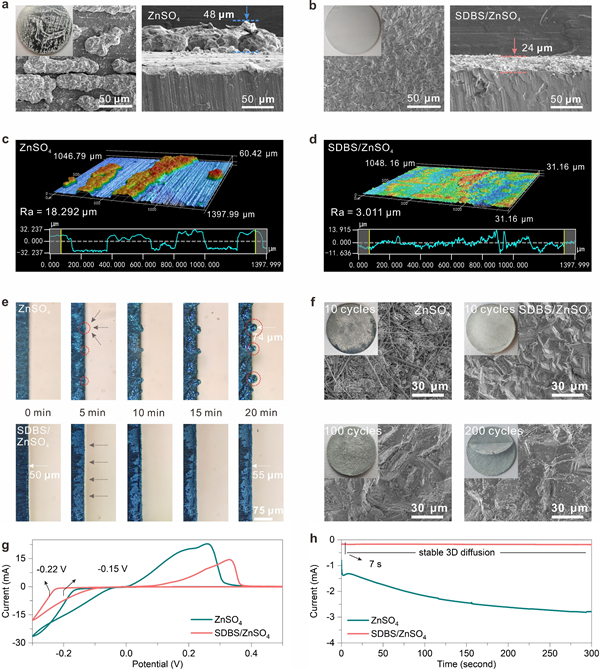 图3. 在(a)ZnSO4和(b)SDBS/ZnSO4电解液中10 mAh cm−2沉积1 h后锌片的表面和截面SEM图;(c, d)ZnSO4和SDBS/ZnSO4电解液中10 mAh cm−2沉积1 h后锌片表面的3D共聚焦显微图;(e)10 mA cm−2下ZnSO4和SDBS/ZnSO4电解液中沉积的原位光学显微观察图;(f)5 mA cm-2和5 mAh cm-2下循环不同圈数(10次、100次和200次)后循环Zn表面的SEM图像;ZnSO4和SDBS/ZnSO4电解液中的(g)成核过电势曲线和(h)恒电位时间-电流曲线。