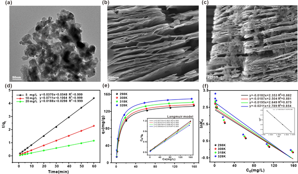 图1.(a)La-Mg LDH的TEM图;(b)Ti3C2TX的SEM图;(c)La-Mg LDH/Ti3C2TX的SEM图;La-Mg LDH/Ti3C2TX吸附氟的(d)一级动力学,(e)Langmuir模型和(f)热力学模型图。
