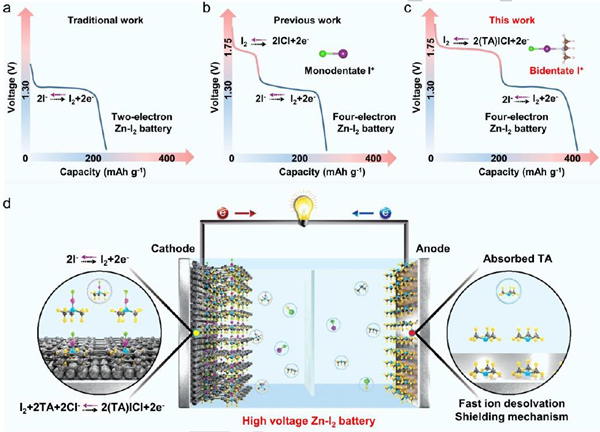图. 利用多功能电解液添加剂三甲胺盐酸盐(TAH)构筑高电位水系Zn-I2电池机理示意图。