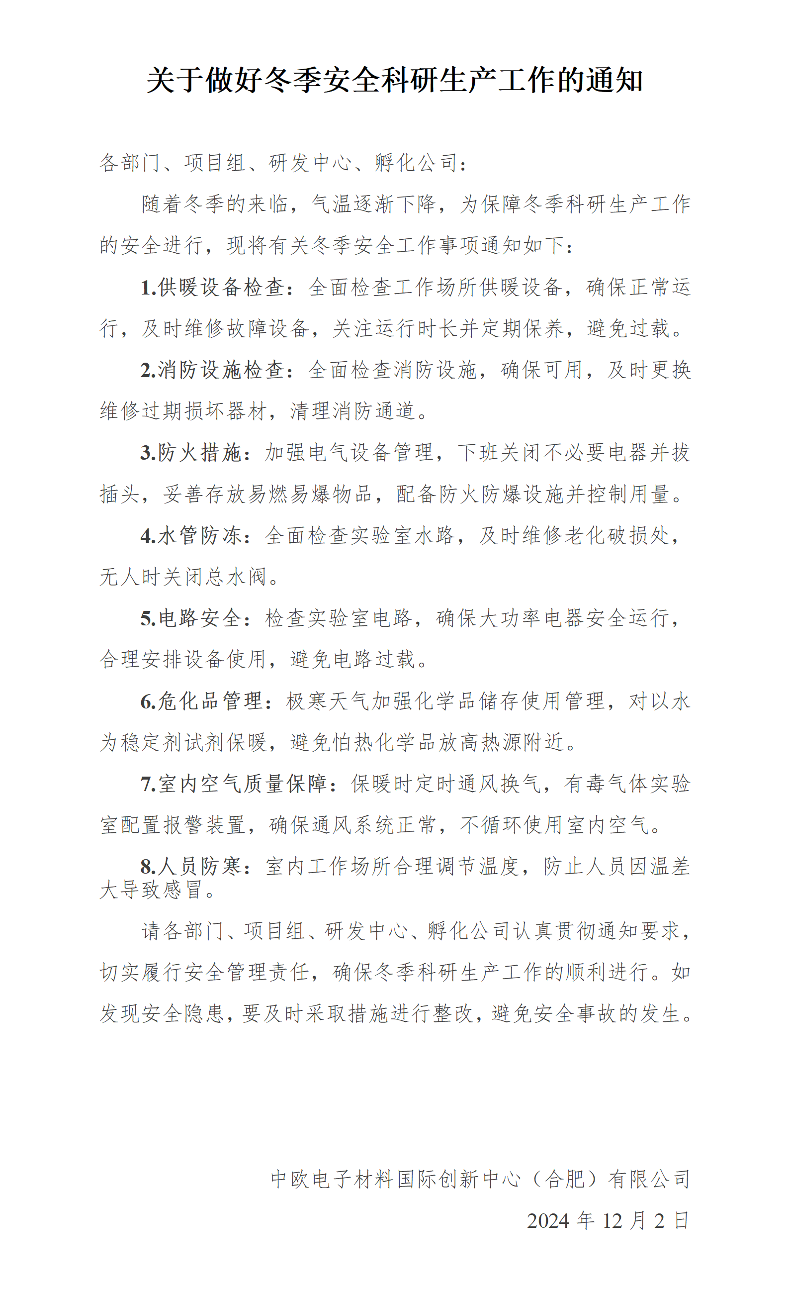 赢博在线(中国)唯一官方网站做好冬季安全科研生产工作的通知