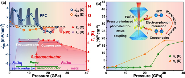 图1. PbSe0.5Te0.5的超导、正光导(PPC)-负光导(NPC)转变、晶体结构演化相图和载流子浓度随压力演化图谱及其光电-晶格耦合机制示意图。