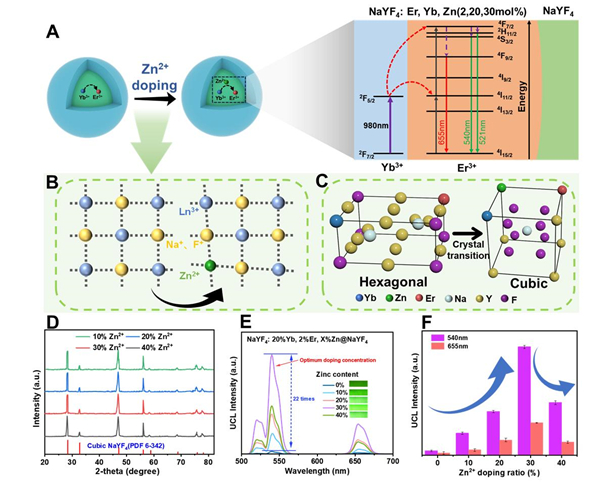 图1. 锌离子调控前后上转换纳米粒子的晶格、晶相及荧光强度的变化。