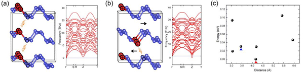 图1. 12.5% P原子掺杂结构,声子谱和能量。(a) 最低能量的构型和 (b) 动力学不稳定的构型和及其相应的声子色散关系;黑色箭头指示了声子谱Z点虚频振动的方向。用橙色波浪线连接的带正负电荷的原子间形成N-P偶极矩。(c) 能量随层间P-P距离变化的关系图。