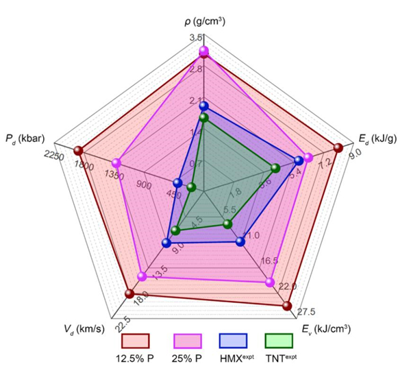 图2. 12.5%和25% P原子掺杂BP-N的密度ρ、能量密度Ed、体积能量密度Ev、爆速Vd和爆压Pd。