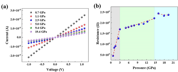 图2. 掺杂5%Y-HfO2在高压下的I-V曲线(a) ,电阻随压力的变化(b)。