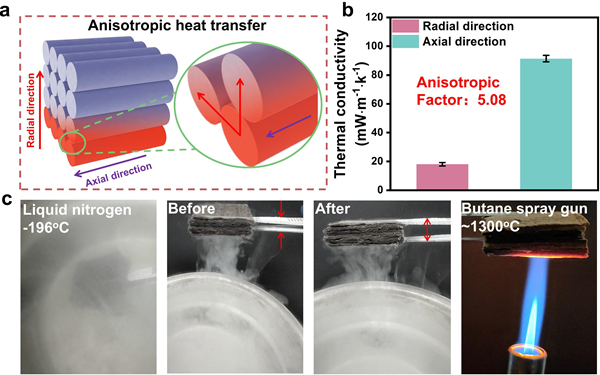 图2. 高取向 SiC@SiO2 纳米纤维气凝胶各向异性热导率与极端热稳定性。